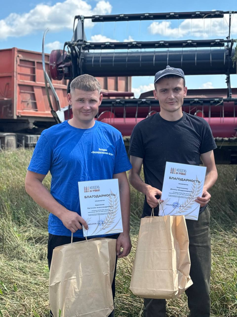 В лидерах республиканского проекта "Молодежь - за урожай" экипажи в составе Евгений Кукреш и Гришков Назар, а также Кремень Евгений и Чернышов Денис из ОАО "Речень" Любанского района, которые намолотили 1246 т и 1092,66 т. В этом году в данном хозяйстве на уборке урожая задействовано 5 молодежных экипажей.